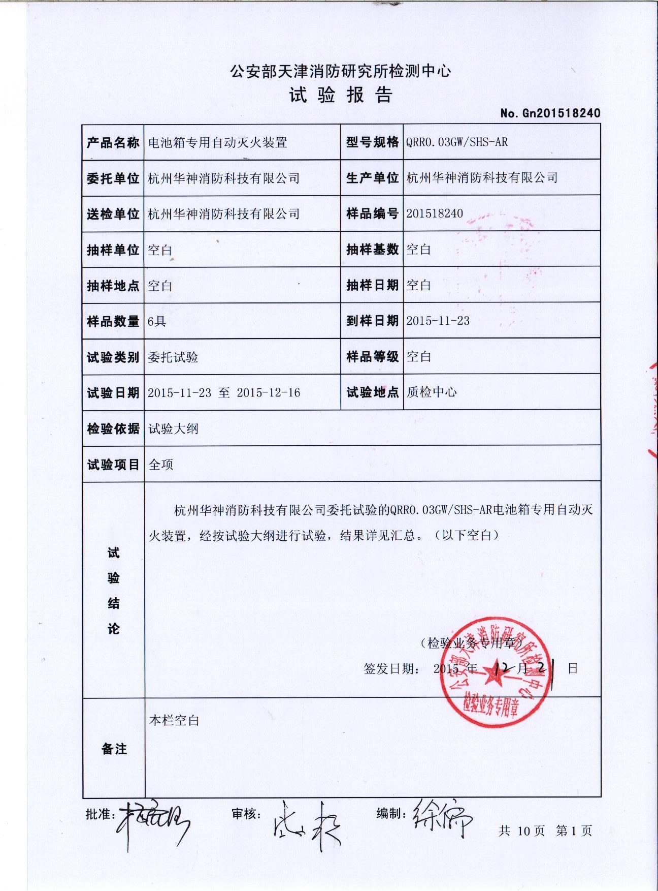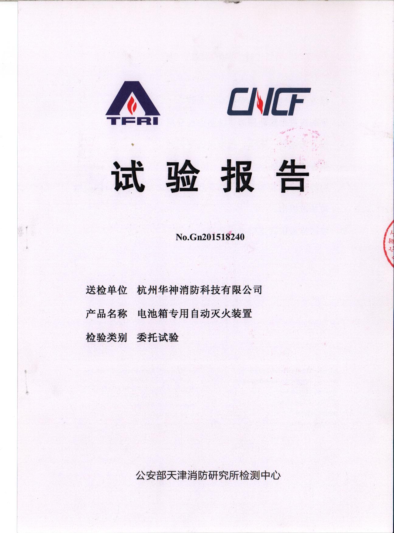 “恒神”電池箱專用自動滅火裝置通過公安部天津消防研究所檢測中心試驗