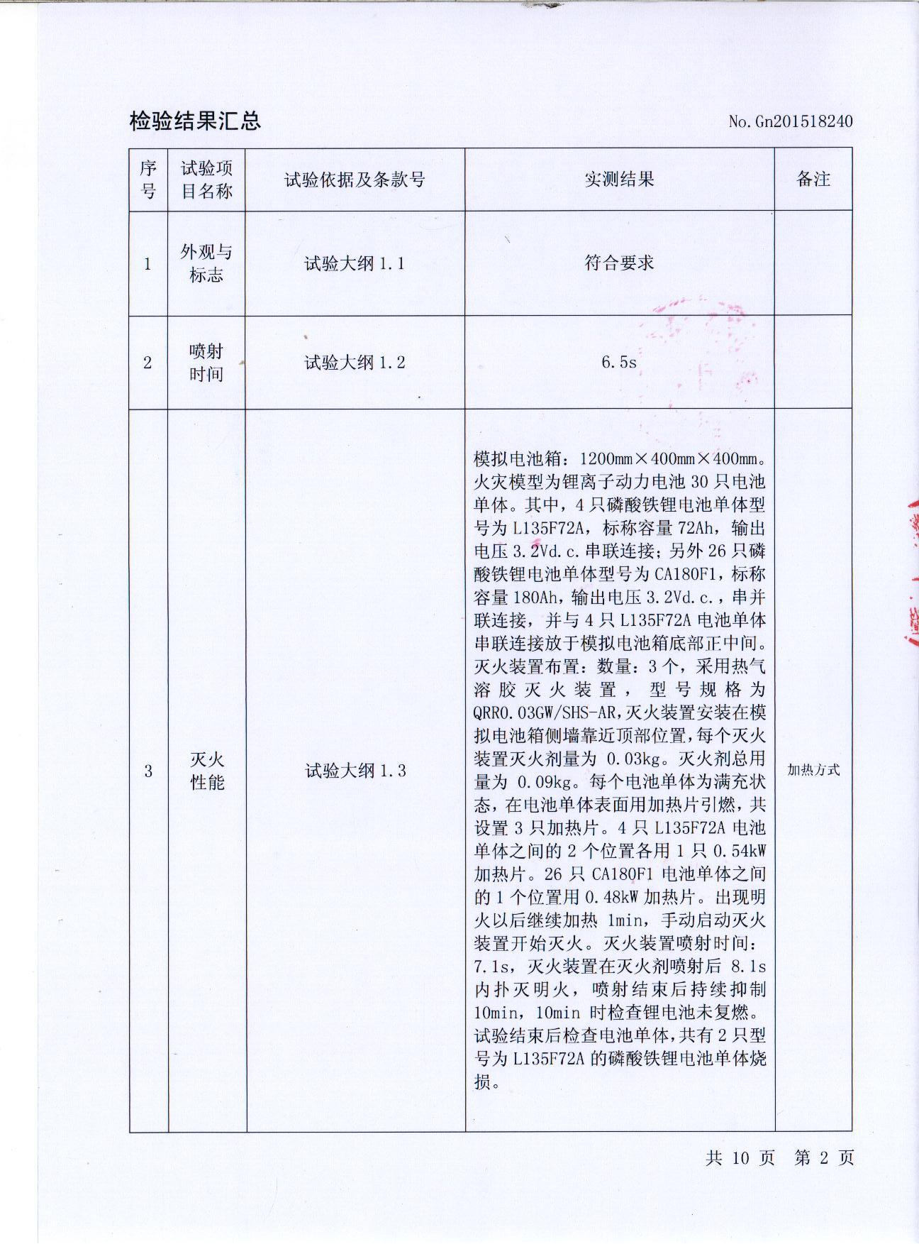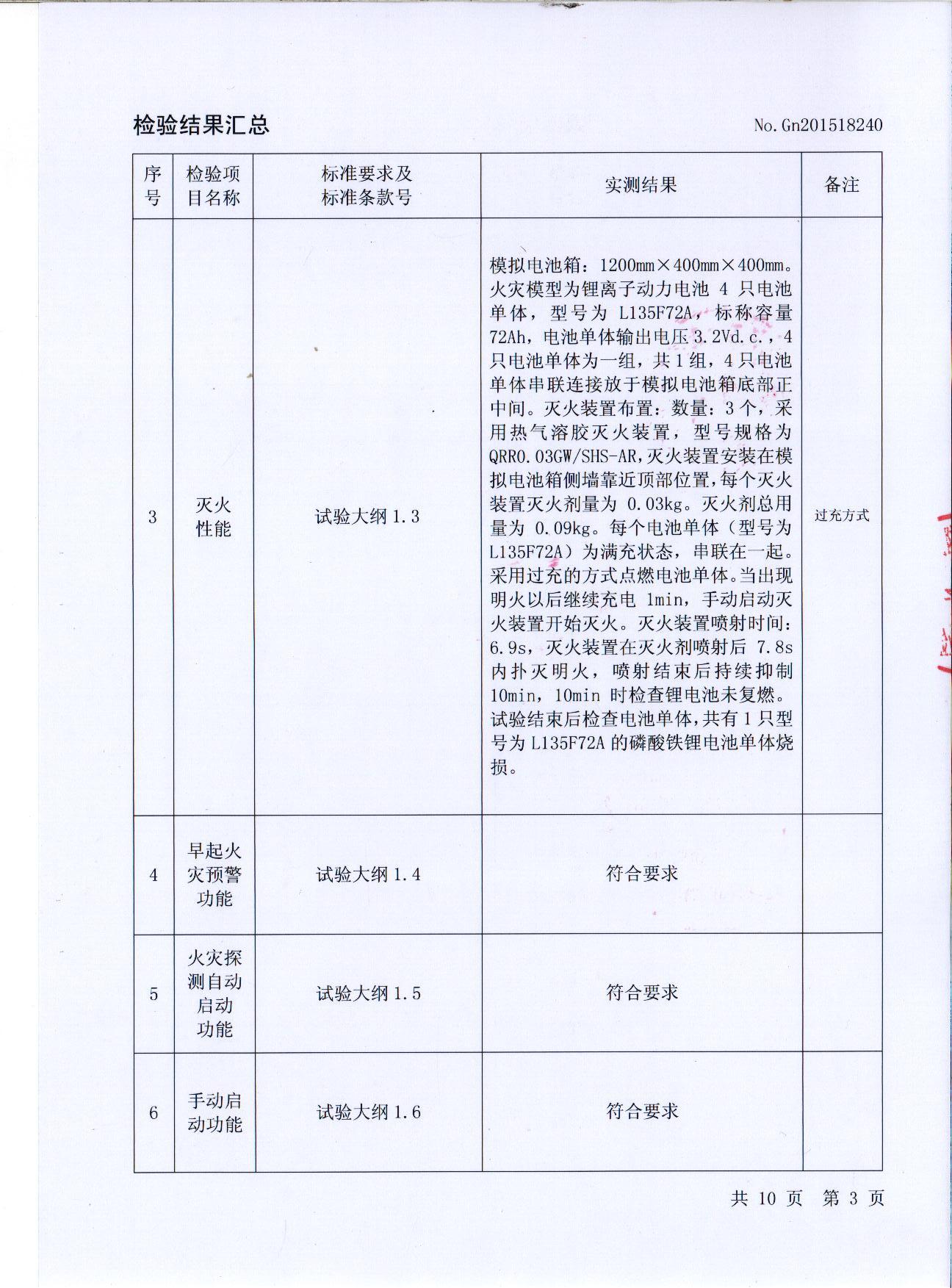 根據(jù)1:1模擬電池箱電池成組滅火試驗測試,電池箱專用自動滅火裝置在外觀與標志、噴射時間、滅火性能、早期火警預警功能、火災探測自動啟動功能、手動啟動功能等方面的功能設定均符合測試大綱要求,達到國家要求的技術(shù)標準。