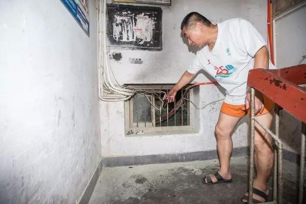通往二樓的樓道里,一個(gè)赤膊大伯正盯著電力工人施工。樓道里還能聞到一股焦味,配電箱的墻壁明顯被熏黑了,有幾個(gè)電閘底座被燒融化了。