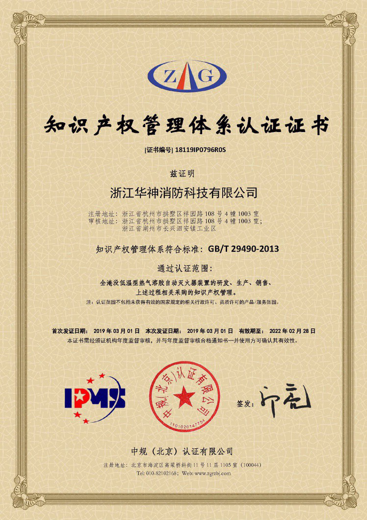 華神消防于2019年3月1日正式獲得由中規(guī)(北京)認(rèn)證公司頒發(fā)的《知識(shí)產(chǎn)權(quán)管理體系認(rèn)證證書(shū)》(證書(shū)編號(hào):18119IP0796R0S),這標(biāo)志著我司在知識(shí)產(chǎn)權(quán)創(chuàng)造、運(yùn)用、管理和保護(hù)方面全面邁入國(guó)內(nèi)領(lǐng)先水平。